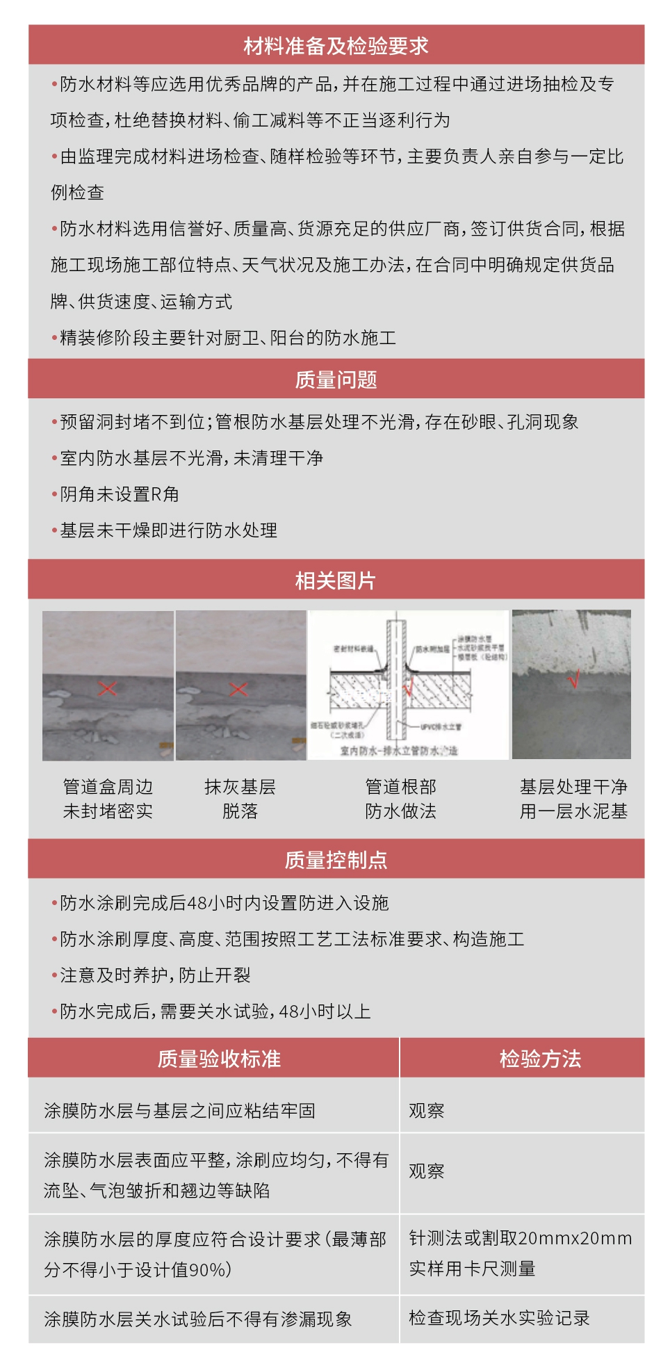 以防水工程為例,具體描述防水工程材料及檢驗(yàn)要求、可能出現(xiàn)的質(zhì)量問(wèn)題、防水基層施工工藝、質(zhì)量控制點(diǎn)及驗(yàn)收標(biāo)準(zhǔn)。