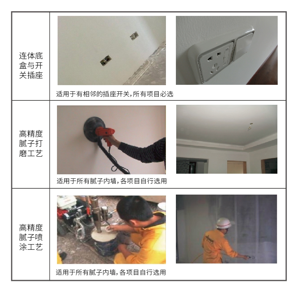 開(kāi)關(guān)面板使用連體底盒與開(kāi)關(guān)插座,可減少底盒之間膩?zhàn)邮湛?,確保四周無(wú)縫隙;膩?zhàn)邮┕な褂酶呔饶佔(zhàn)訃娡繖C(jī),確保膩?zhàn)泳鶆?,并提高施工效率;使用高精度膩?zhàn)哟蚰C(jī)替代傳統(tǒng)手工工藝,效率高、少揚(yáng)塵、膩?zhàn)用娓庸饣秸?/span>