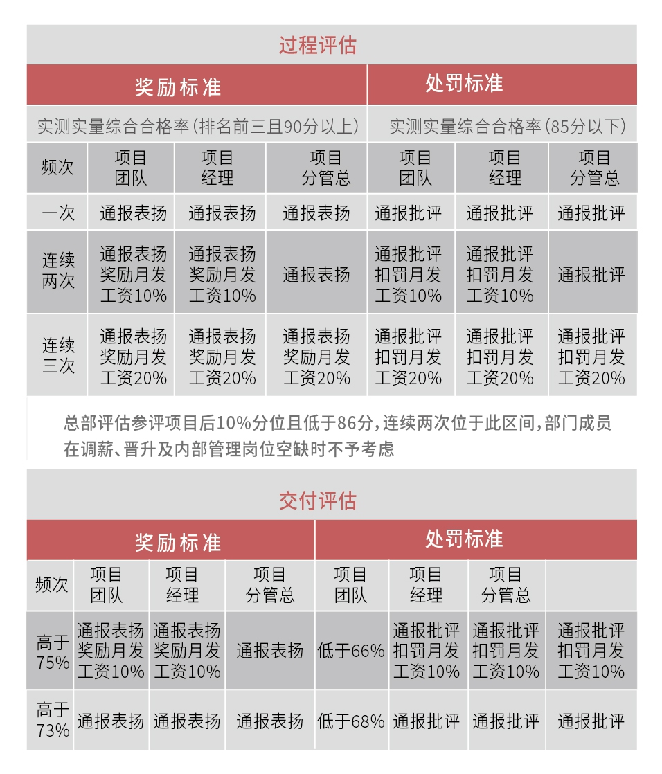通過(guò)建立并執(zhí)行獎(jiǎng)罰標(biāo)準(zhǔn),將過(guò)程/交付評(píng)估成績(jī)與內(nèi)部人員、供方掛鉤,提高內(nèi)部人員的管理責(zé)任,強(qiáng)化供方履約能力。