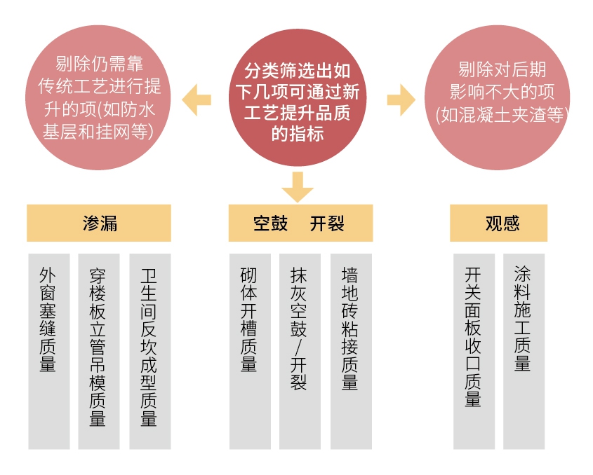 為有效解決滲漏等質(zhì)量通病,逐步推廣新工藝新技術(shù)的應(yīng)用。通過(guò)梳理過(guò)程及交付評(píng)估低分指標(biāo)篩選待提升項(xiàng),制定針對(duì)性的工藝改進(jìn)方案。